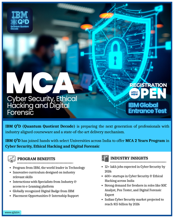 IBM Q²D is a global initiative offering specialized master’s programs in collaboration with top academic institutions. We are offering an advanced 2-year MCA program specializing in Cybersecurity, Ethical Hacking, and Digital Forensics.