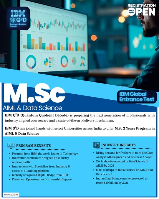 IBM Q²D is a global initiative offering specialized master’s programs in collaboration with top academic institutions. We are offering an advanced 2-year M.Sc Computer Science program specializing in AIML & Data Science.
